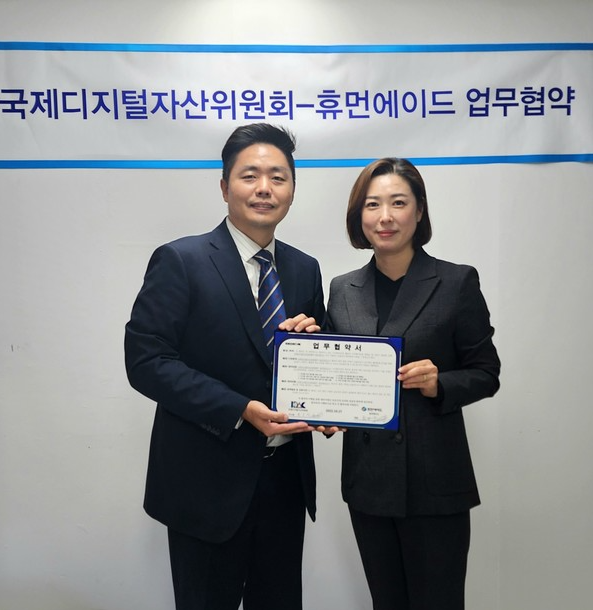 ▲국제디지털자산위원회와 휴먼에이드 MOU 체결 장면(좌: 국제디지털자산위원회 원은석 이사장, 우: 휴먼에이드 최연우 대표)